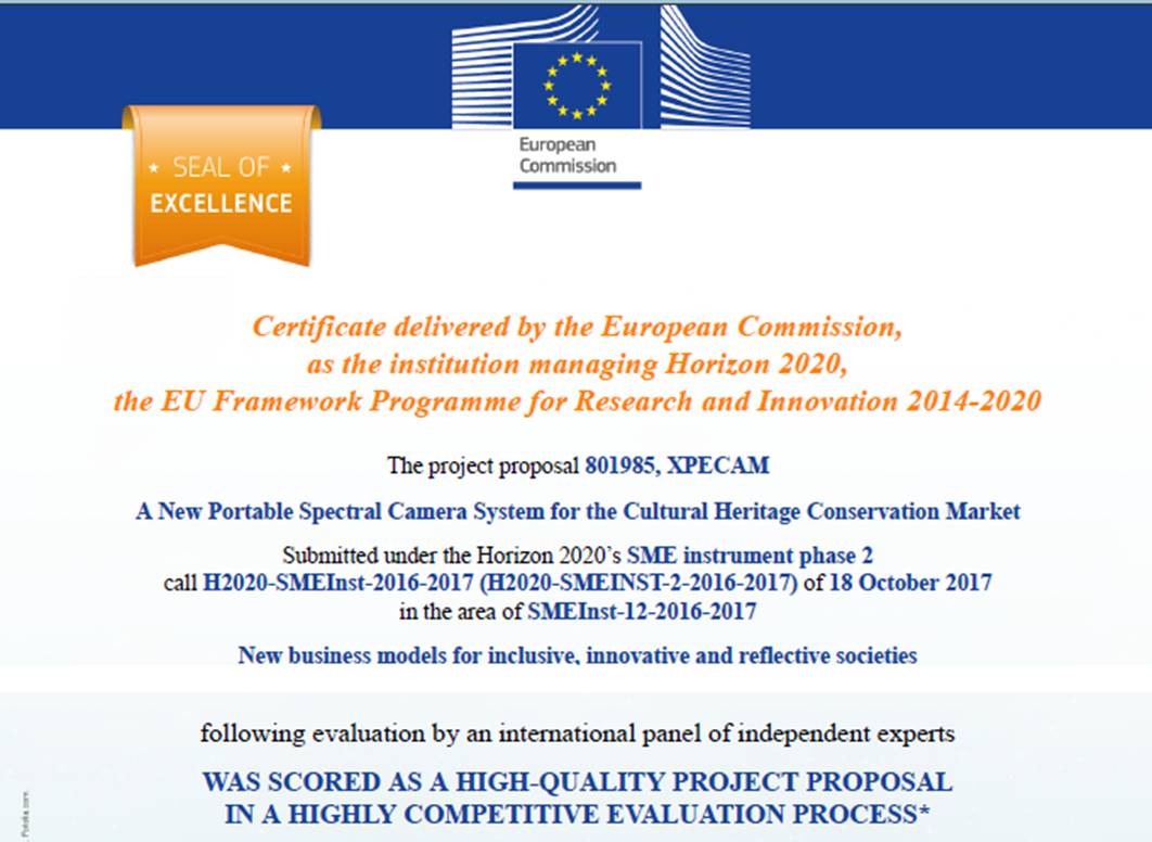 Il progetto XPECAM presentato nell’ambito della fase 2 del Horizon 2020 SME ha superato tutte le soglie di valutazione ed è stato insignito del Sigillo di Eccellenza Horizon 2020.
