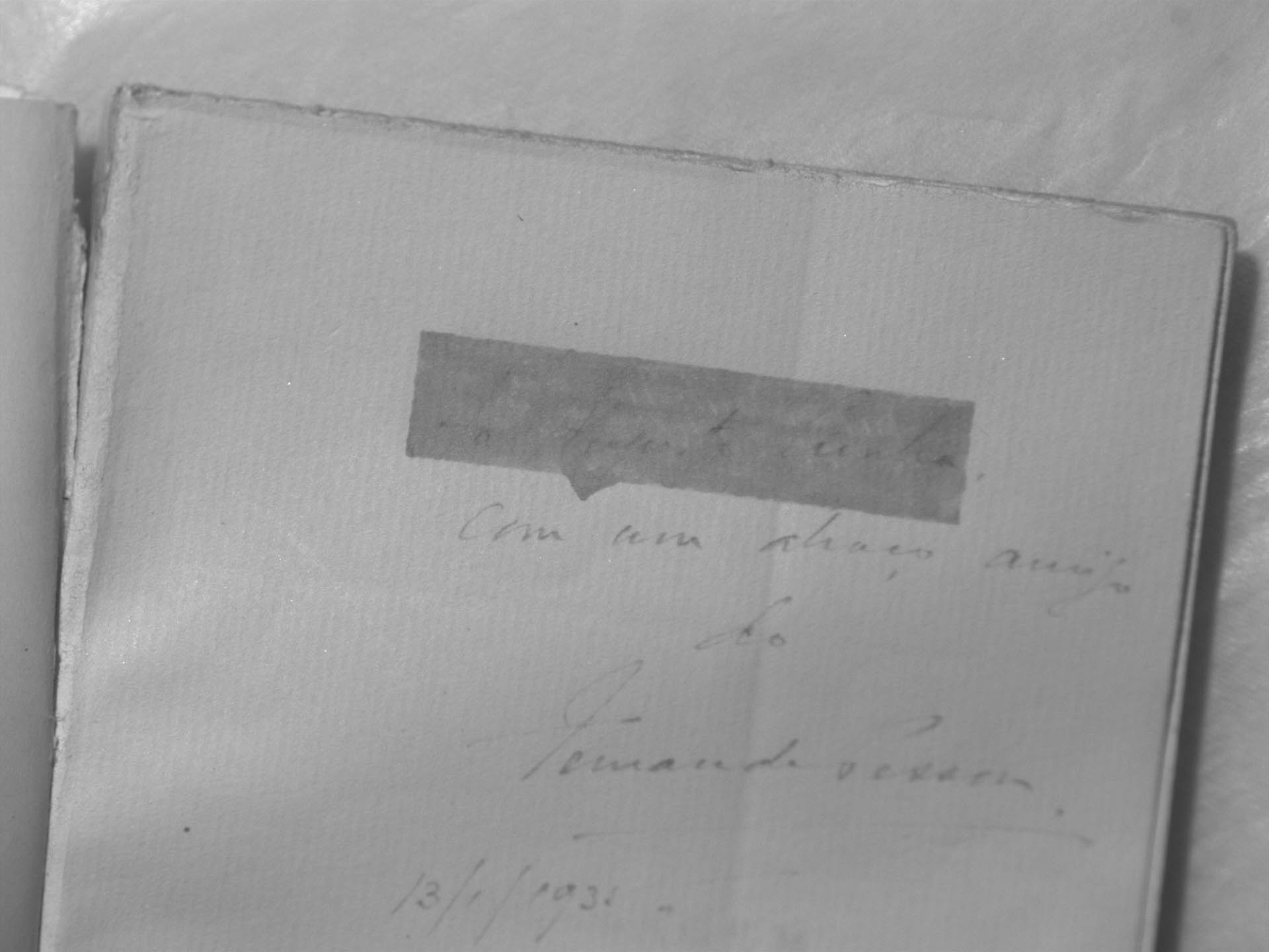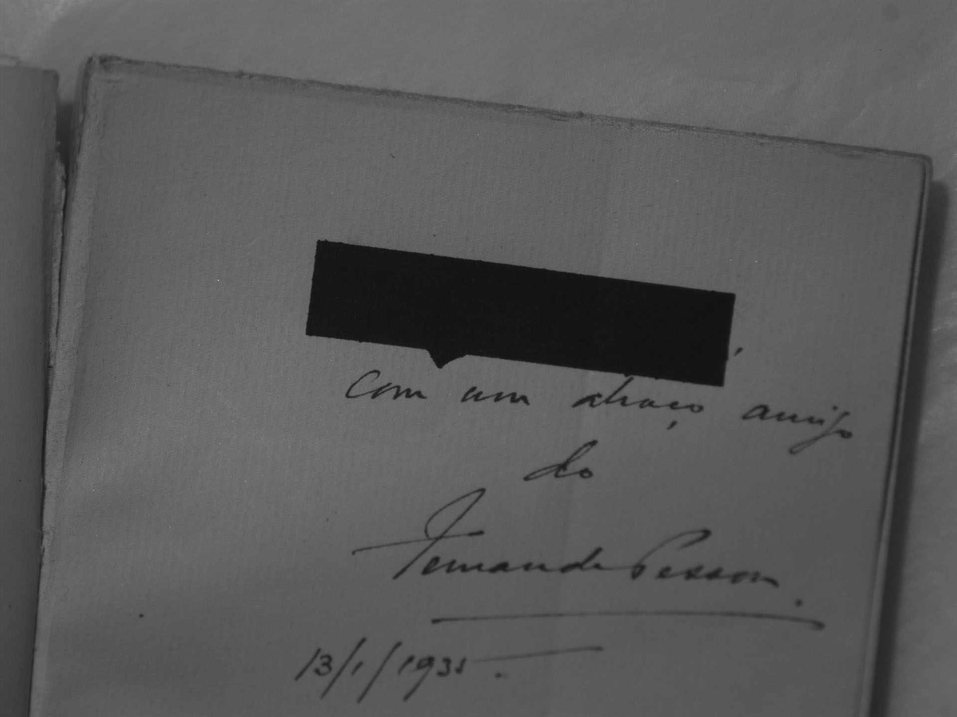 Una copia originale del libro “Messagio (Messaggio)” di Fernando Pessoa con dedica cancellata. Il nome della persona alla quale Fernando Pessoa aveva dedicato il libro era stato nascosto con un spesso strato di inchiostro nero, rendendo impossibile vedere il nome sottostante.